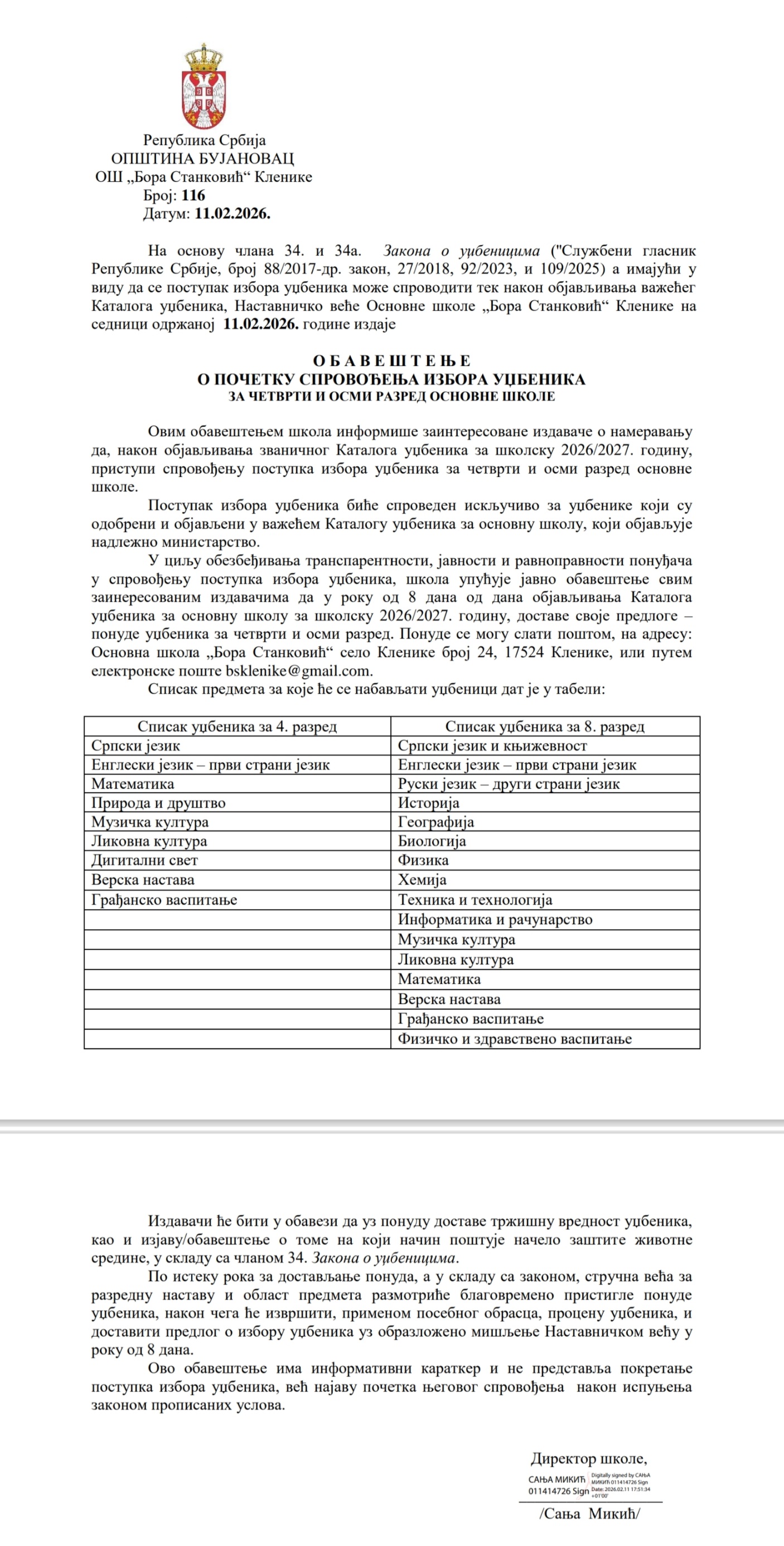На основу члана 34. и 34а. Закона о уџбеницима (''Службени гласник Републике Србије, број 88/2017-др. закон, 27/2018, 92/2023, и 109/2025) а имајући у виду да се поступак избора уџбеника може спроводити тек након објављивања важећег Каталога уџбеника, Наставничко веће Основне школе „Бора Станковић“ Кленике на седници одржаној 11.02.2026. године издаје Обавештење о почетку спровођења избора уџбеника за четврти и осми разред основне школе са којим се можете упознати у прилогу испод.