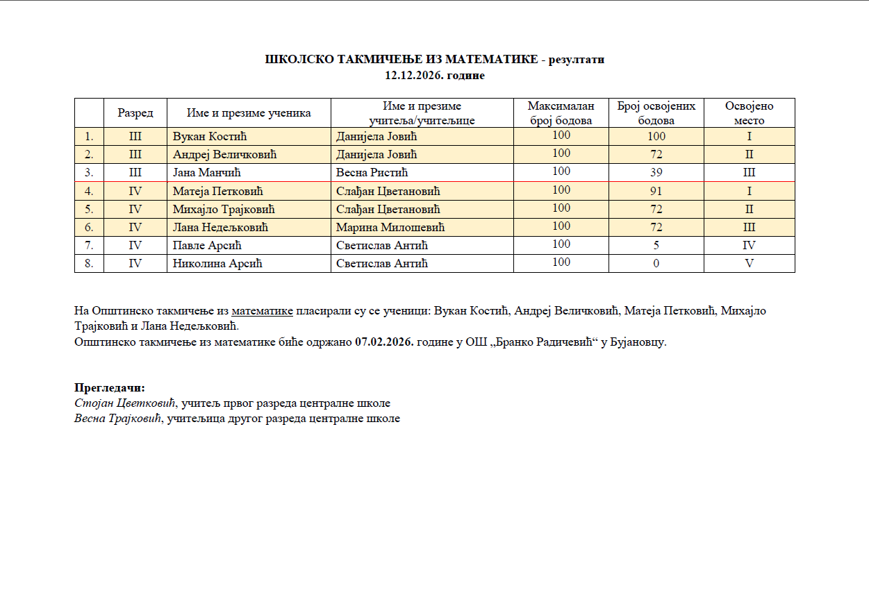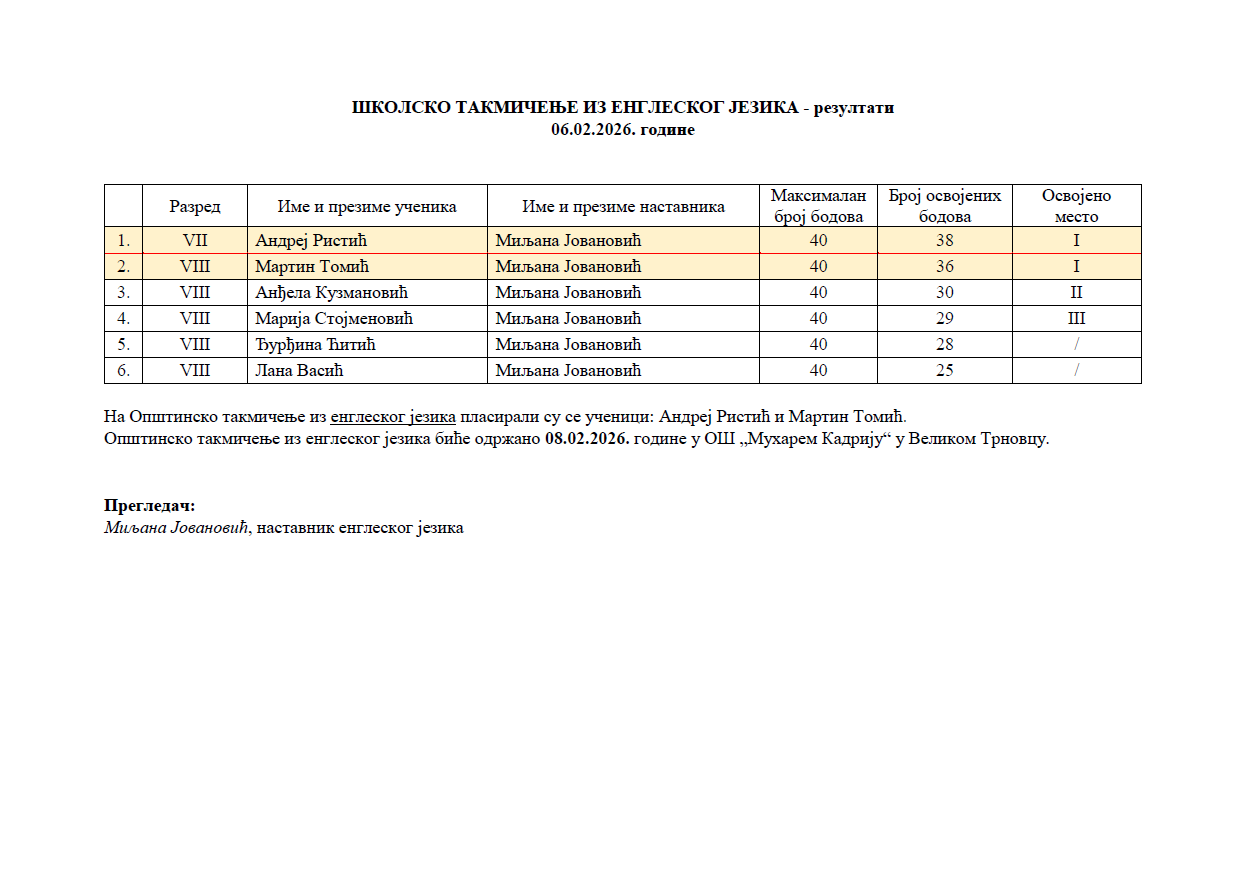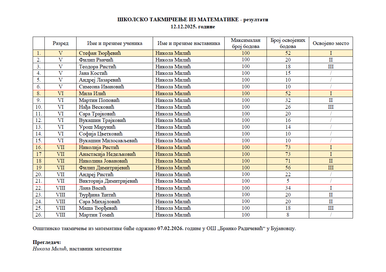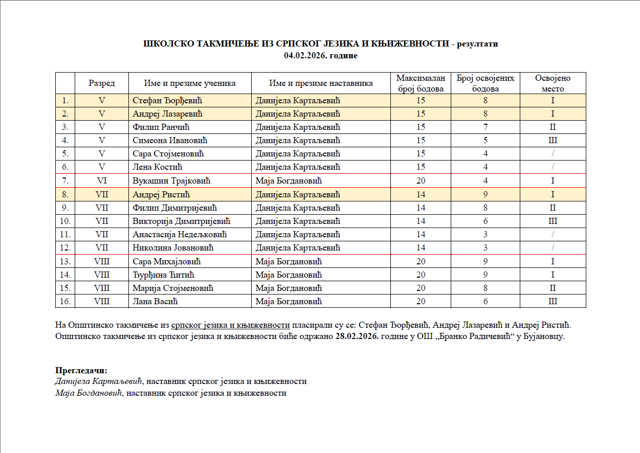 Школска такмичења РЕЗУЛТАТИ 2025/2026