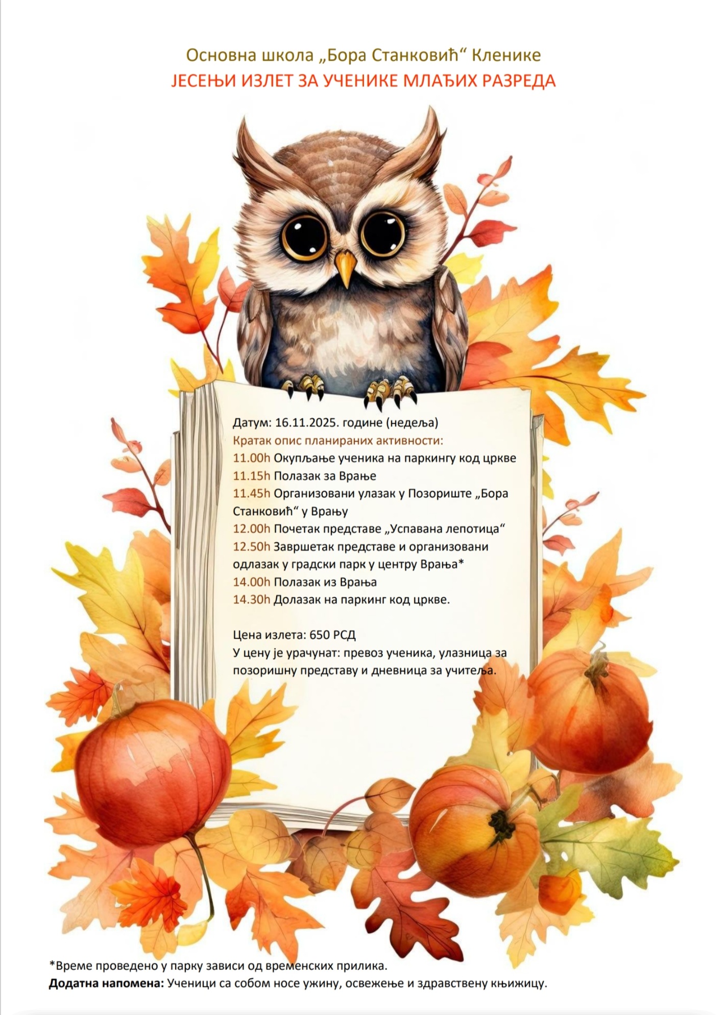 Јесењи излетДатум: 15. Februar 2026 17:56 Категорија: ОбавештењаДраги ученици, поштовани родитељи, ове године Основна школа "Бора Станковић" у Кленику по први пут организује Јесењи излет за ученике млађих разреда који обухвата посету позоришту! Списак планираних активности можете погледати у наставку овог текста а све остале информације добићете од ваших учитеља. Унапред се радујемо заједничком дружењу у топлим бојама јесени! ![]() |